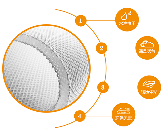 2、干爽網(wǎng)面通風(fēng)透氣:采用雙面網(wǎng)孔,呈現(xiàn)六面透氣中空立體的結(jié)構(gòu)。